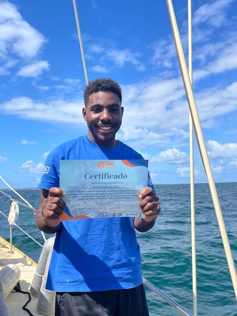 “Inicialmente formamos 5 jovens em um curso de restauração de corais. Nesse curso trabalhamos com pescadores, marisqueiras e jovens, ensinando um pouco sobre a vida dos corais e a importância que ele tem para o ambiente”, contou.
