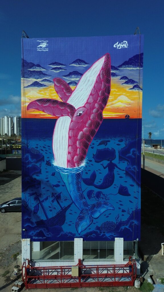 O mural “O Salto da Jubarte”, localizado na orla de Pituaçu, em Salvador, foi revitalizado após nove anos desde sua criação pelo grafiteiro Galvão. A obra, que foi seu primeiro trabalho de grande escala realizado de forma independente, sofreu os efeitos do tempo, o que motivou a repintura. O trabalho, feito ao longo de oito dias durante o carnaval, incluiu o uso de várias latas de spray e a aplicação de uma camada de resina para garantir maior resistência ao desgaste natural.